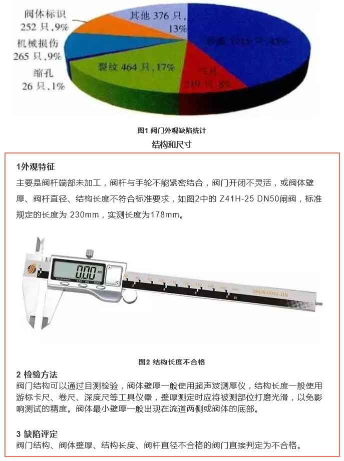 2014年,長慶油田技術監測中心共檢驗各類閥門 170284只,有 5622只閥門不合格,不合格率為3.30%,其中外觀質量檢驗不合格2817只,占檢驗不合格總數的 50.11%。 主要有砂眼、氣孔、裂紋、機械損傷、縮孔、標志和閥體壁厚不合格等(如下圖 圖1)
