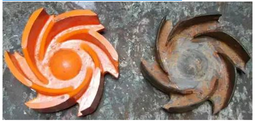 水泵壁面在高強(qiáng)度沖擊力的反復(fù)作用下,金屬表面產(chǎn)生局部變形與硬化變脆,產(chǎn)生金屬疲勞現(xiàn)象,使金屬破裂與剝落。除力學(xué)作用外,還夾雜著水體中逸出的深入活潑氣體(如氧氣)對金屬的化學(xué)腐蝕以及水體對金屬的電化學(xué)腐蝕等。在綜合作用下,水泵壁面起初是出現(xiàn)麻點(diǎn),繼而變成蜂窩狀,嚴(yán)重時壁面會在短期內(nèi)被擊空。