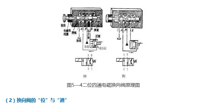 圖5—4所示為滑閥式電磁換向閥的換向原理及相應的圖形符號圖。它變換油液的流動方向是利用閥芯相對閥體的軸向位移來實現的。換向閥變換左、右位置,即使得執行元件變換了運動方向。此閥因有兩個工作位置,四個通口,閥芯靠電磁鐵推力實現移動,所以稱作二位四通滑閥式電磁換向閥。