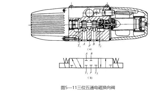 圖5-11所示為35D-25B型三位五通板式交流電磁換向閥的結構和圖形符號圖。當左、右電磁鐵均斷電時,其閥芯在兩端彈簧的作用下處于中位(圖示位置);當左電磁鐵通電時,即推動推桿將閥芯頂向右端;當右電磁鐵通電時,即推動推桿將閥芯頂向左端,從而實現了油路的換向。