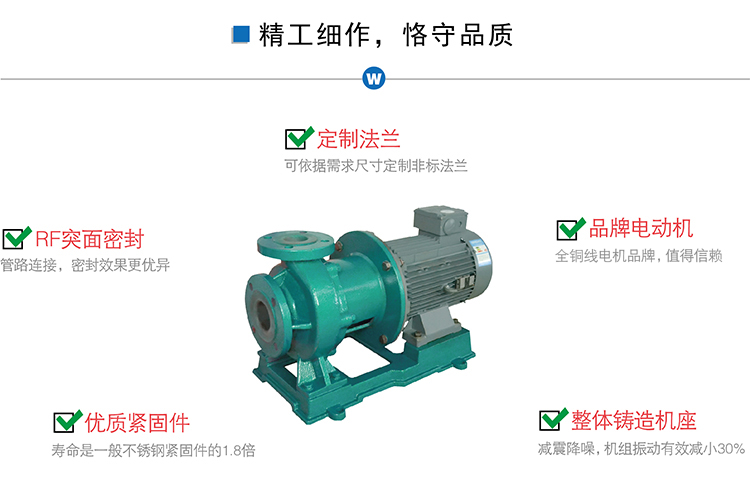 氟塑料磁力泵又稱其為氟塑料磁力離心泵、襯四氟磁力泵、氟塑料磁力驅動泵、耐腐蝕磁力化工泵,CQB-FJ襯氟磁力泵是我公司氟塑料磁力泵中的全新升級款型,產品性能好,運轉更加穩(wěn)定,材質更好,全封閉無泄露,適合現(xiàn)代化的環(huán)保要求。